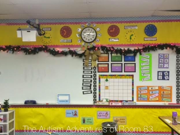 Here are some of our decorations we put up. I put up christmas lights on our bulletin board holiday tree as well as christmas lights around our white board. The students LOVE the lights. They “work for” the lights to be turned on. If our class is getting to crazy or hyper, the lights go off. It’s a great motivator. During rest time after lunch we turn off the classroom lights and only leave on the holiday lights. They LOVE it ๐