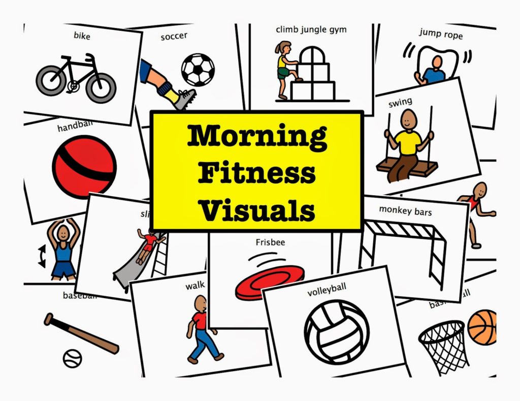 Around 8:40, From the bench I excuse the students to Morning Fitness. I typically run Morning Fitness for my class. It changes every day and is the most laxed part of our day. Every day we do different activities. I do fun silly things often, like swing 50 times and we all count out loud. We run around the handball courts and basketball courts. We play tether ball, handball and basketball too. I try to keep it fun and incorporate sharing, rule following and team building skills. It’s not necessarily a drill sergeant type of PE. I use these Morning Fitness Visuals to prompt students to the activity. Sometimes we only do one activity in the morning, and other days we do several. Click on they mage below to get theses visuals for free for your classroom!
