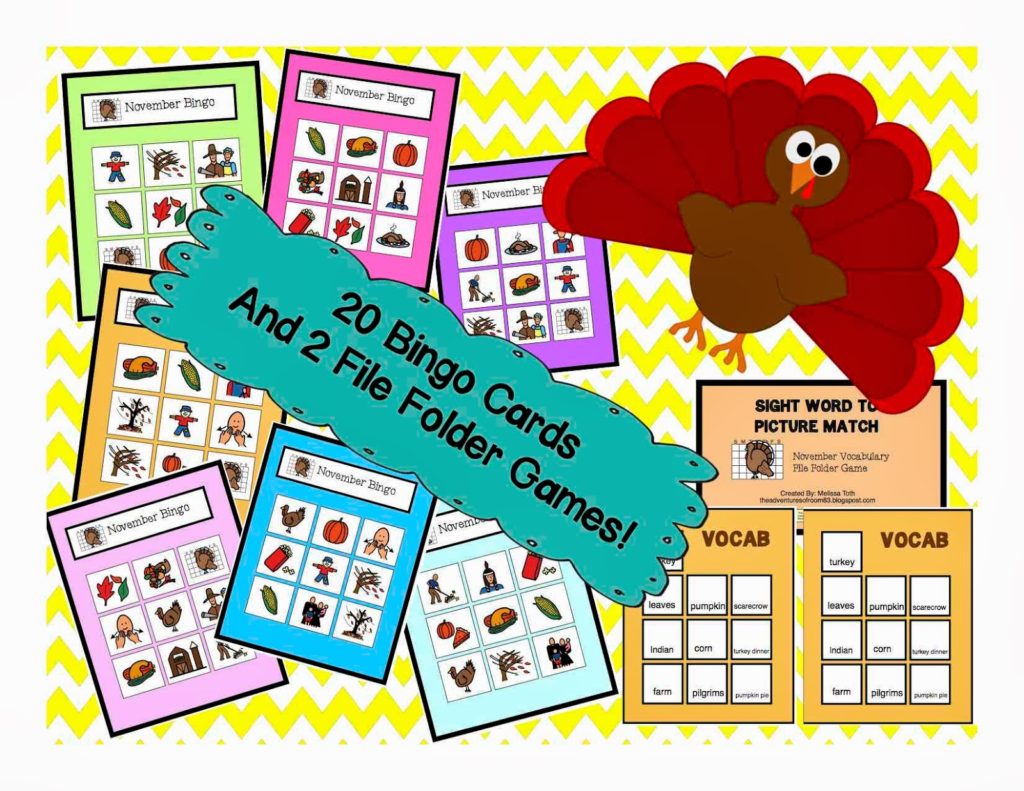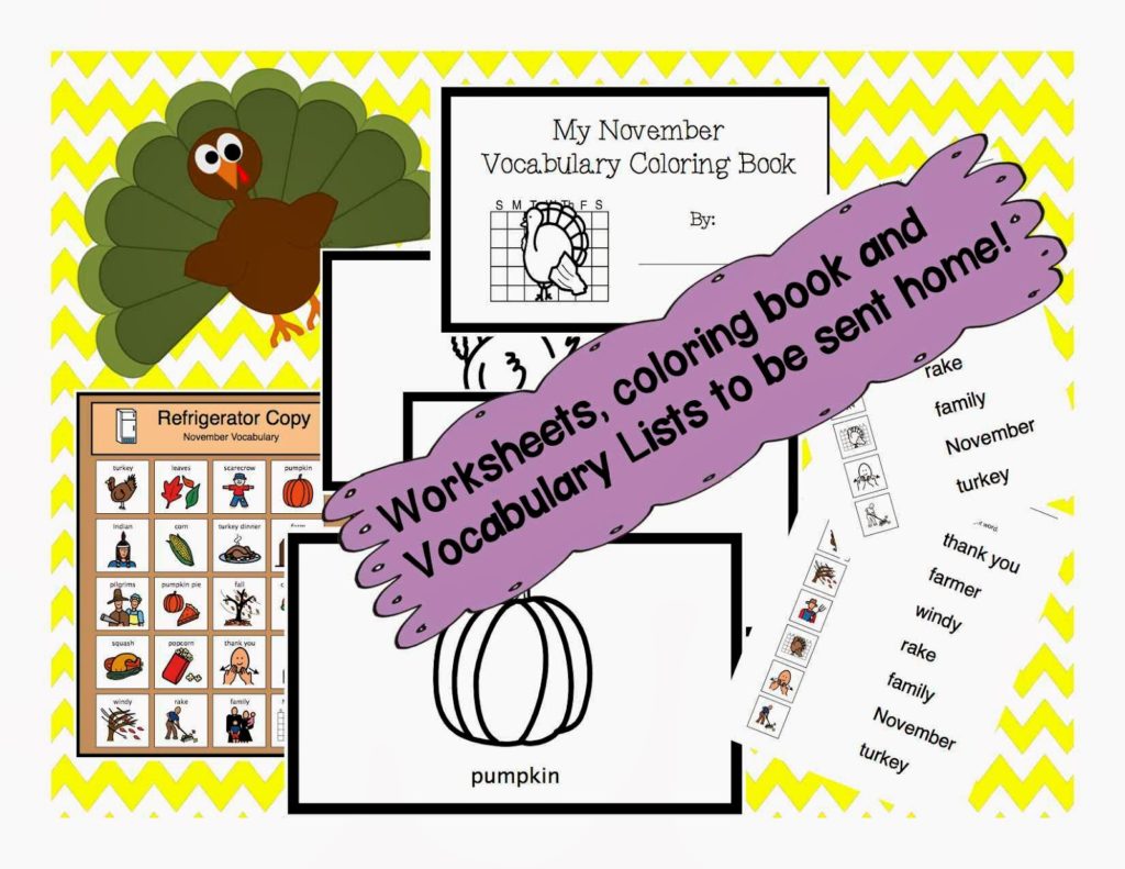 I have a new vocabulary bundle for the month of November. The vocabulary words for November are: November, turkey, leaves, scarecrow, pumpkin, Indian, corn, turkey dinner, farm, cornucopia, fall, pumpkin pie, pilgrims, squash, popcorn, thank you, farmer, family, rake, windy.