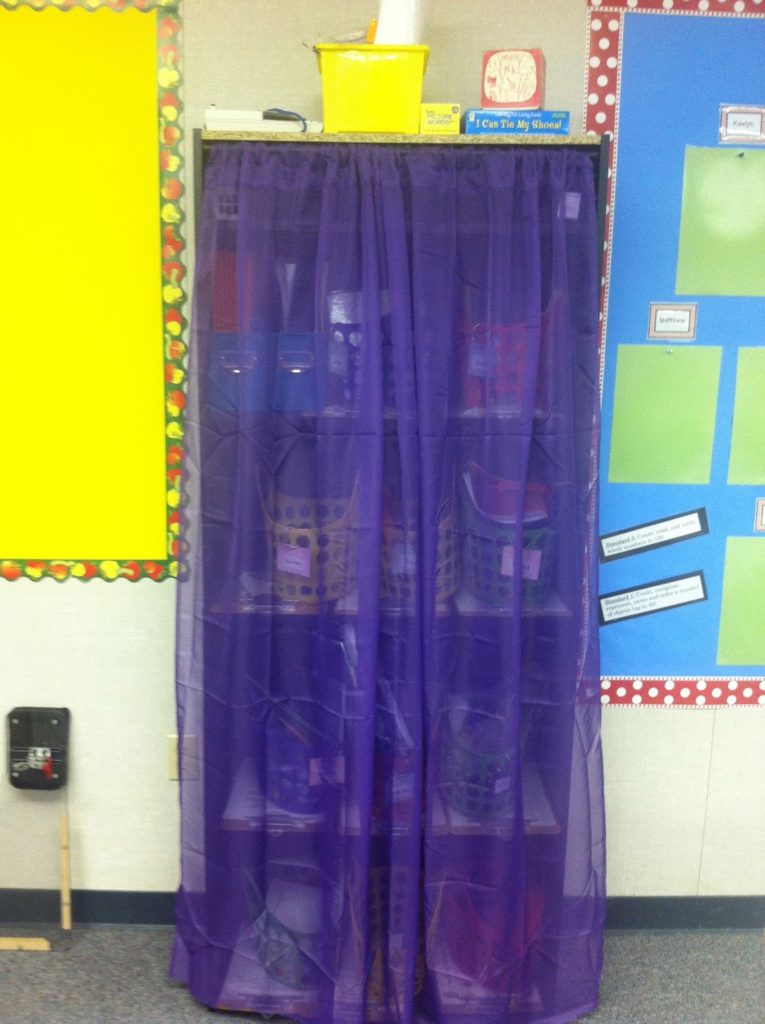 I added a small tension rod to the top inside of the bookshelf. I then bought a cheap sheer curtain from Big Lots. I love this because I can pull the curtain to the side when we are using the materials, and close it for the rest of the day… OUT OF SIGHT OUT OF MIND… right?