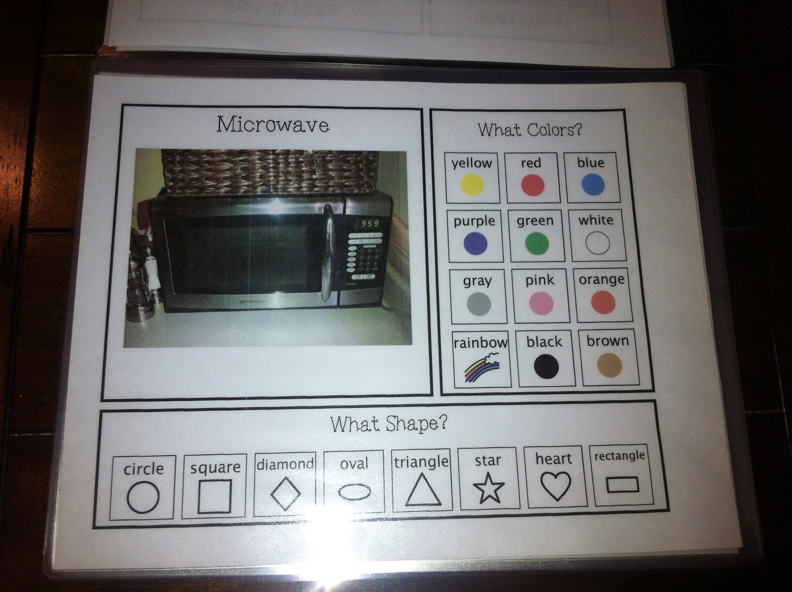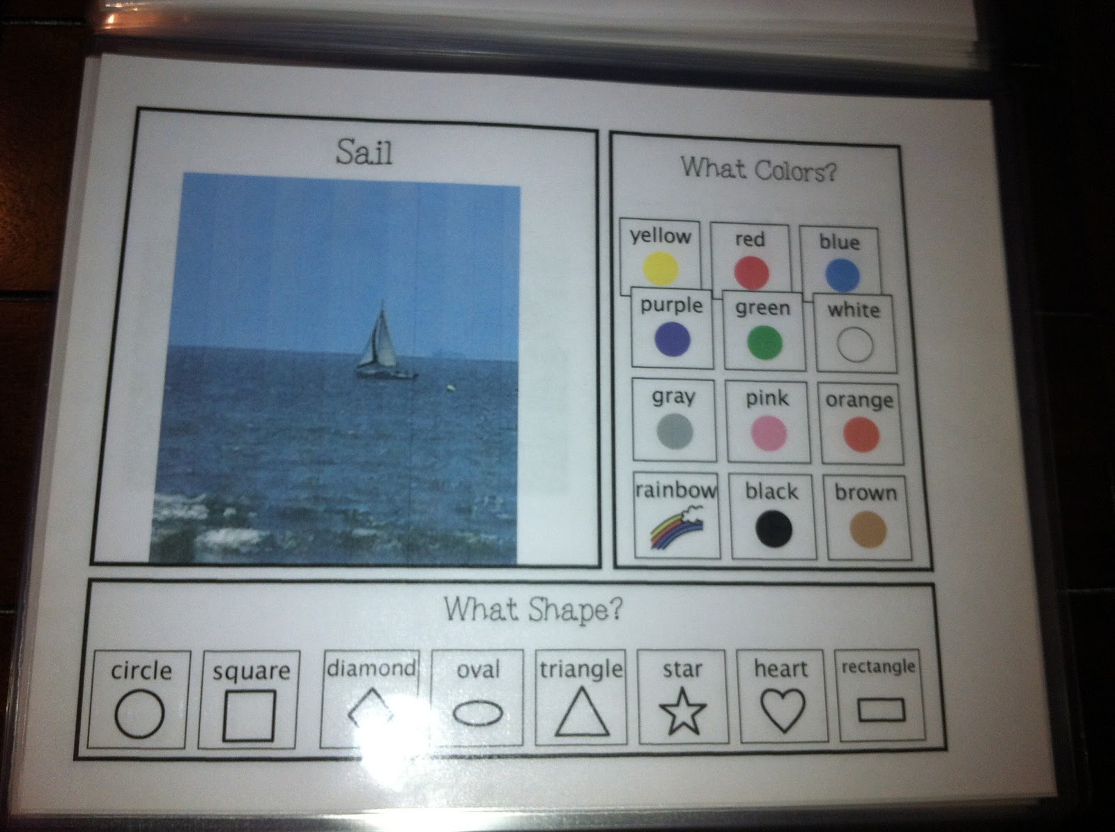 At the end of the book, I have three review pages. I have a shapes page, a colors page, and a shapes in our environment page. These can be used for quick assessment or for review prior to completing the adapted book.