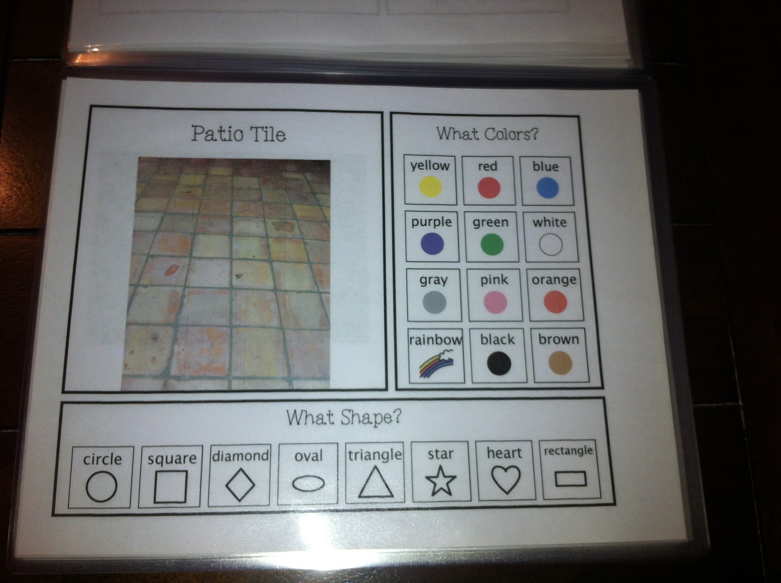 At the end of the book, I have three review pages. I have a shapes page, a colors page, and a shapes in our environment page. These can be used for quick assessment or for review prior to completing the adapted book.
